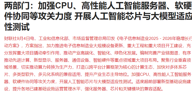 其中提到,加强CPU、高性能人工智能服务器、软硬件协同等攻关力度,开展人工智能芯片与大模型适应性测试。这算是利好国产算力了,但现在市场未必是反馈这个利好。